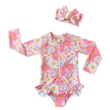 The cutest rash guard will keep your perfect babe protected from the sun on those bright days on the ocean! Make sure to grab your matching swim turban, headwrap or bow!