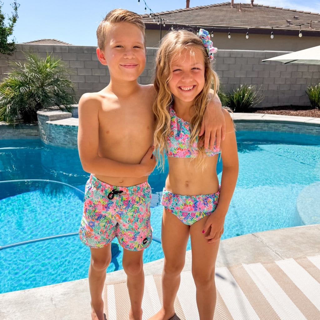 These stylish swim shorts are ideal for hanging ten! Match with your bestie babes with our matching two piece! Swim trunks are designed to be mid-thigh.